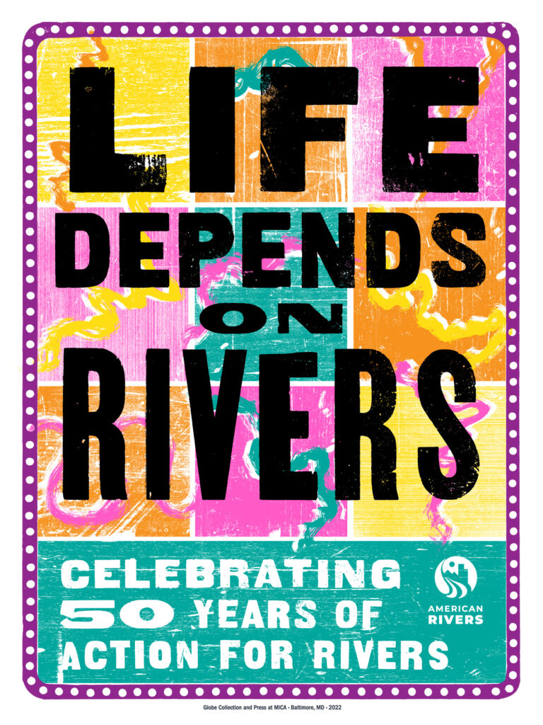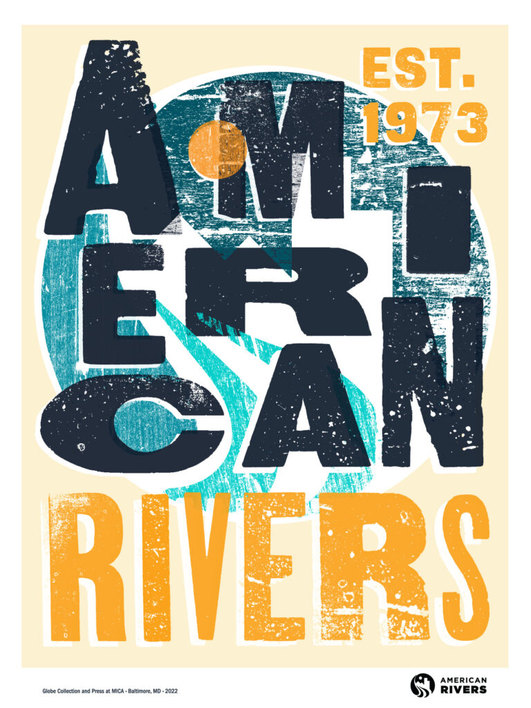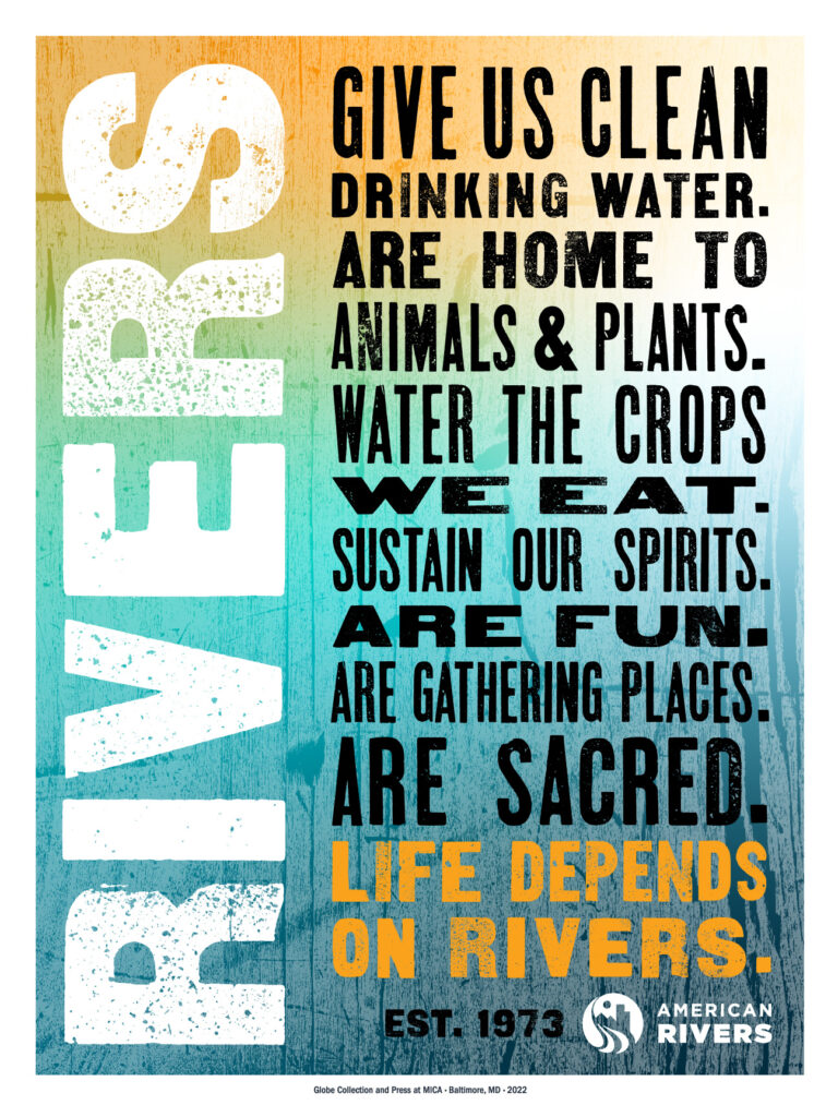 For example, take the poster that says, “Life Depends on Rivers.” That is the one that is most classically Globe, with a colored background and black wood-type text on top. We pulled the idea of the background from American Rivers’ annual list of America’s Most Endangered Rivers®. The background for that poster is made up of wood-type textured graphics of our loose interpretation of what the shape of those endangered rivers look like.
