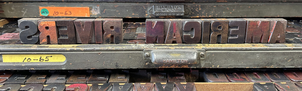 There’s a really nice symbiosis of using wood type as the base of these graphics. Because without rivers, trees don’t grow. We are kind of coming full circle in the materials that we’re using to do this design work — because it wouldn’t exist without water in rivers.